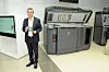 VISER: Konserndirektør for 3D print, Ramon Pastor viser en kompleks tredimensjonal modell laget av HP Jet Fusion 3D 4200 ved siden av Ramon Pastor. Maskinen bygger opp modellen lag for lag i én passering for materialet og en for herding. FOTO: Ahlert Hysing