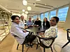 FELLESSKAP: Riyaz Hamidon og Nadeesha De Silva (foran) fra Sri Lanka startet i Align i oktober 2023. Bak er Aligns Per-Egil Josten, sammen med Trine Maren Skott-Myhre og Kolbjørn Stuvebakken fra Kontorhuset, hvor Align leier lokaler. Birgitte Hanstad (t.h).