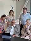 DIGI-HJELPEN: Det er stort engasjement hos de som deltar under fremleggingen av handlingsplanen for digital inkludering på Alna bydelshus på Furuset tirsdag ettermiddag. F.v. digihjelper Simran Seema, brukerne Munir Ahmed og Leif Solheim. Bak statssekretær i Barne- og familiedepartementet Trine Fagervik og kommunal- og distriktsminister Sigbjørn Gjelsvik. (Foto: KKD)