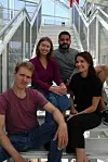 FIKK STØTTE: Litech er en av bedriftene som fikk støtte til å utvikle miljøteknologi i år. De utvikler sensorteknologi som gjør at batterier i for eksempel leker og ipader ikke forårsaker branner på avfallsanlegg. Slike branner fører til giftig røyk og til at slukkevann renner ut i naturen. Fra venstre: Joschka Winkel, Synne Sauar, John Byron og Ida Marie Pedersen i Litech. (Foto: John Byron)