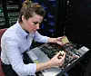 VISER: Testingeniør Stefanie Chiras i BM tester maskiner med Power9 i Austin Texas. I høyre hånd holder hun elektronikkbrikken med 8 millioner transistorer. I venstre hånd holder hun brikken ferdig innkapslet som plasseres i kontakten (socket). I den 2 U høye datamaskinen benyttes væske for å avlede varme slik at klokkefrekvensen kan være på 4 GHz. Foto IBM, Jack Plunket.